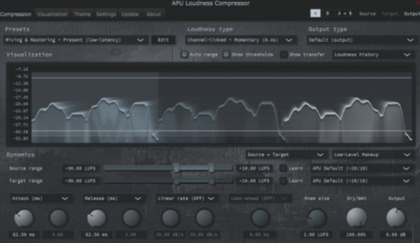 APU 响度压缩器(APU Loudness Compressor)是一款压缩 / 扩展器,专为支持现代响度标准(LUFS、真峰值,True Peak)设计。这意味着其压缩曲线以 LUFS 测量值为基准生成,而非均方根(RMS)或峰值(Peak)。由于 LUFS 是更精准的响度测量单位,因此该压缩器能实现高度透明的压缩效果,尤其适合母带处理与后期制作工作流程。