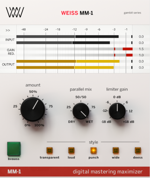 MM-1具有与原始数字硬件单元完全相同的算法,提供了五种限制。 透明,响亮,有力,宽阔和荒漠; 随着“数量”旋钮的旋转而智能地前进,并且可与混音控件融合,从而在您的母带感觉上为您提供适量的力量。