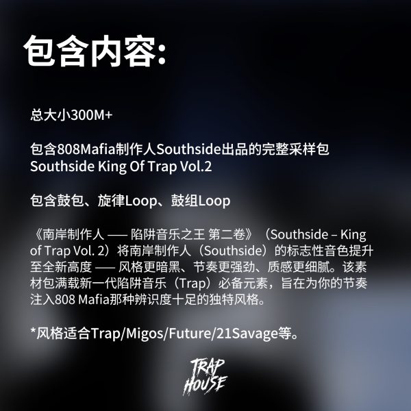 第二轮强势回归!Southside – King of Trap Vol. 2 将 Southside 的标志性音色提升至全新境界——更加黑暗、强劲、精致。这款素材包囊括了新一代 Trap 音乐的必备元素,旨在为你的节拍注入 808 Mafia 独树一帜的锋芒。凭借一系列令人难忘的旋律、震撼人心的鼓点和撼动人心的 808 低音,这款续作带来了更充沛的能量、更丰富的情感和更强劲的冲击力。无论你是想打造夜店热曲还是街头氛围音乐,这款素材包都能满足你的需求。