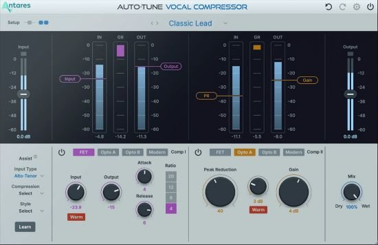 Auto-Tune Vocal Compressor is an advanced dual-stage compressor for modern vocal production. Key compression styles driven by next-generation machine learning make finding the best compression settings fast and easy.
