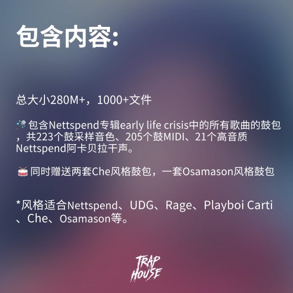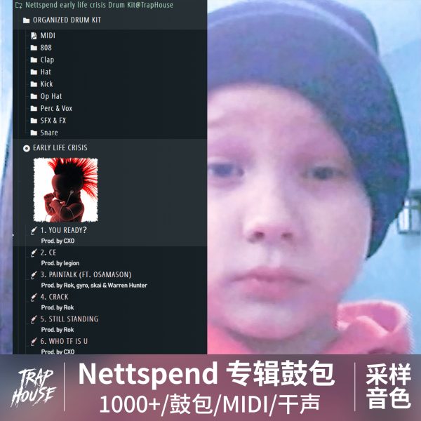 包含Nettspend专辑earlylife crisis中的所有歌曲的鼓包,共223个鼓采样音色、205个鼓MIDI、21个高音质Nettspend阿卡贝拉干声。