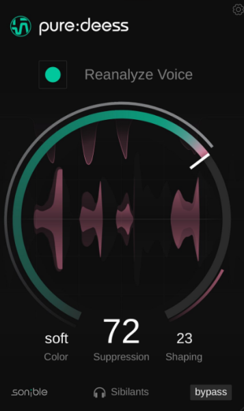 Set the Color parameter to Soft, Balanced or Sharp to define the sound of sibilants in the voice. Rather than just affecting the gain reduction amount, pure:deess uses the ‘voiceprint’ analysis to arrive at a new target spectrum for each sibilant sound. The Shaping parameter is linked to the chosen Color. When increased, this feature performs more spectral processing to the sibilant sound rather than broadband, uniform shaping.