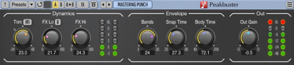 Peakbuster is a transient (attack-phase) boosting, resonance smoothing, and harmonic enhancement AudioUnit, AAX, and VST plugin for professional music and sound production applications. Peakbuster is a multi-band transient enhancer effect plugin that uses an advanced automatic algorithm. Peakbuster stands from the competition in its ability to always sound natural, even on a full-spectrum master bus. The strength of the effect depends on the material being processed: the algorithm masterfully analyses dynamics of the sound it processes, and applies boosting or cutting in quantities that are “exactly right”. Moreover, the algorithm has a suitably “fast” reaction time making its adjustments sound “fluid”, and not “all over the place”………..