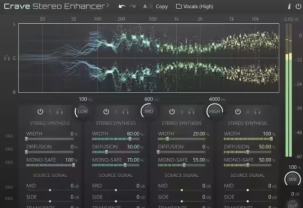 Crave Stereo Enhancer is a four-band stereo widener engineered for precision control, transparent sound, and adjustable mono compatibility for both mono and stereo sources.