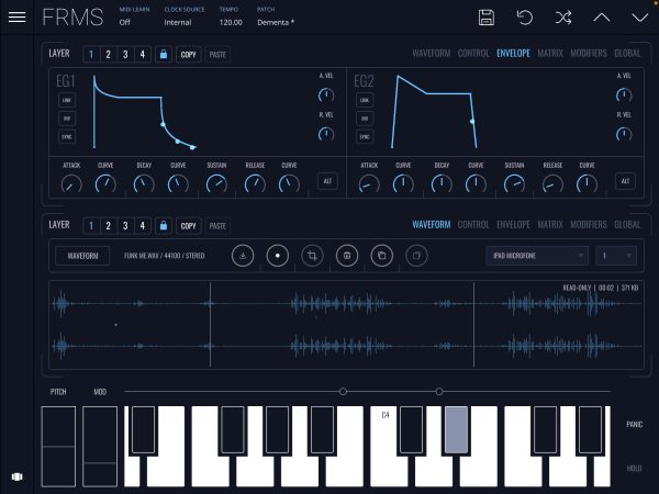 FRMS takes the interesting and exciting world of granular synthesis and gives it a musical edge by mixing it with FM synthesis to produce a wide variety of possible timbres, with a sleek and modern interface. From heavily-dense ambient drones, to glitchy mechanical beings, turn simple sounds into complex evolving soundscapes, with up to four layers of synthesis in any combination.