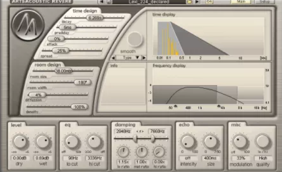 welcome to the ArtsAcoustic Reverb. the ArtsAcoustic Reverb is a high quality reverb for everyday use in a professional studio. this plugin is (unlike the current trend) a highly advanced, but easy to use algorithmic reverb, so no convolution is involved.