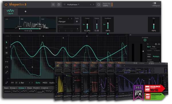 ShaperBox is your go-to tool for rhythmic inspiration, musical motion, and mixing magic. Nine powerful Cableguys Shaper effects come together in one easy, modern interface.